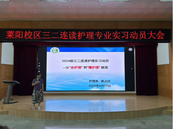 6月17日下午,护理系2023级实习动员大会在学术报告厅隆重召开。校企合作部副主任项东宇、护理系主任高占玲、党总支书记张琳琳出席会议并作专题指导,全体2023级师生通过线上线下相结合方式参会。三二连读护理专业实习动员会已于当日上午先行举行。