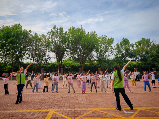 随着特色舞蹈教学环节的展开,现场气氛迅速升温。志愿者将八段锦中的“两手托天理三焦”等经典招式,与拍八虚动作巧妙融合,搭配欢快活泼的《健康到到令》音乐,创编出一套富有节奏感与趣味性的律动舞蹈。在教学过程中,志愿者耐心讲解、逐一示范,从动作的起势到招式的衔接,悉心指导每一位学生。孩子们全神贯注,模仿有序,许多小朋友还自发担任起“小助教”,主动协助同伴调整动作、纠正姿势,现场洋溢着“比学赶帮”的和谐氛围。