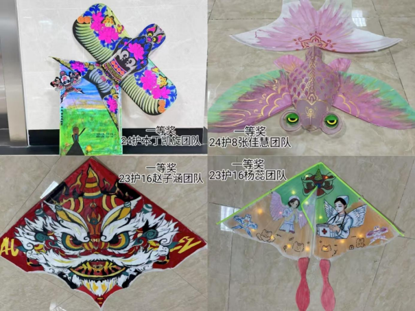 活动受到了23、24级各班级同学们的积极响应,参赛作品风格多样:有的绘制白衣天使守护生命的画面;有的勾勒草药与针灸的意象;还有的倡导绿色健康理念等。其中23级护理16班赵子涵团队的《虎虎生威》巧妙融合了潍坊风筝的传统扎制工艺与现代审美,生动诠释了中华民族昂扬向上的精神风貌;24级护理本科班的丁凯旋的《纸鸢报春》则主体呈现出清新雅致的风格,既展现了"春色满园关不住"的盎然生机,又含蓄表达了作者对"万家安康"的美好祝愿。最终,来自23级护理9班赵子琦团队和24级护理5班刘芮汝团队等9个团队荣获一等奖,23级护理2班刘圣洁团队等23个团队荣获二等奖,24级护理5班冯亚佳团队等38个团队荣获三等奖。