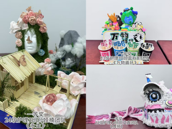 活动得到了23、24级同学们的积极响应,共收到作品200余件。同学们利用课余时间收集的废旧纸箱、塑料瓶、一次性筷子等物品,经过巧手改造,创造出了手工帆船、创意宣传环保公示牌、纸箱吉他等作品,使旧物重新焕发出了盎然生机。其中,23级护理14班巴文鑫团队的舞狮作品,通过纸箱塑料泡沫的组合生动地展现出中华传统文化的魅力。24级护理3班孙娅楠团队的作品《永生》更是艺术与环保的结合,将自然与人融为一体,阐释了保护环境的意义。最终,来自23级护理10班雷秋影团队和24级护理3班孙娅楠团队等三个团队荣获一等奖,23级护理5班赵文君团队等10个团队荣获二等奖,24级护理6班李莹莹团队等17个团队荣获三等奖。23级护理2班刘悦等27个团队获得优秀奖。