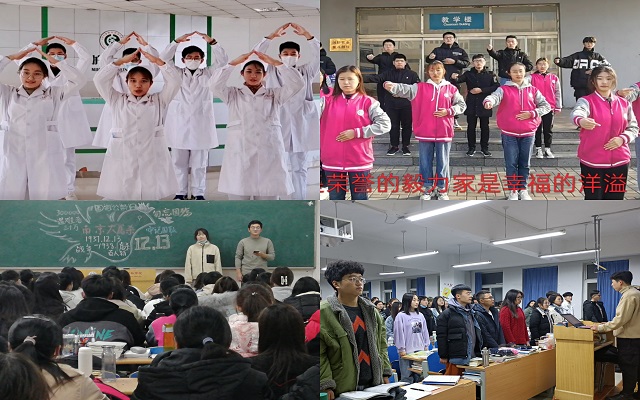 第三,12月13日,各班利用晚自习在班内召开“国家公祭日”主题团日班会。辅导员以PPT与视频相结合的方式向学生全面介绍了南京大屠杀的历史背景、事件的经过以及抗日战争胜利的意义,帮助同学们了解历史,缅怀先烈。在老师的讲解下,同学们深刻领悟到“天下兴亡匹夫有责”的真谛。