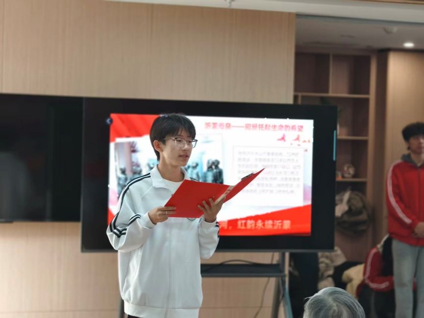 文艺润心,红色传情。志愿者们深情朗诵《沂蒙精神》,舞动《沂蒙颂》,并与老人们合唱《没有共产党就没有新中国》,激昂的旋律引发全场共鸣。在讲述“地雷战”等红色故事时,几位老人打开话匣,动情地回忆起峥嵘岁月的奋斗往事。两代人在泪水与掌声中,实现了跨越时空的精神共鸣与情感交融。