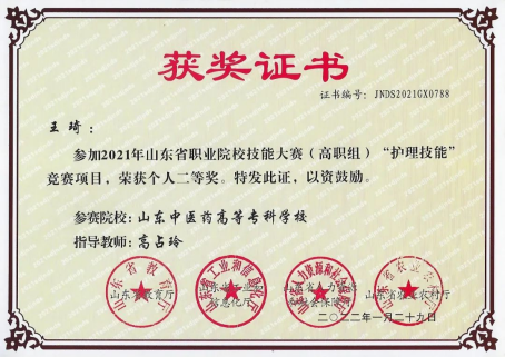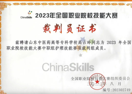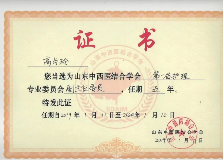 高教授任山东省护理学会第七届理事会常务理事、山东中西医结合学会第一届护理专业委员会副主任委员、烟台市护理学会老年护理委员会副主任委员、全国职业院校技能大赛护理技能赛项(中职组)裁判等职。先后取得教育部1+X证书制度母婴护理考评员及质量监督员和失智老年人照护考务考评员、AHA-BLS培训导师等证书,带领护理系专业教师积极开展母婴护理、失智老年人照护及BLS培训,为区域百姓提供健康查体、保健指导、中医护理技能及急救技能普及等。