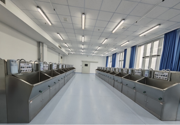 刷手间配备智能感应刷手系统,支持“手部+膝部”双控操作,配合可视化指引墙和全套外科消毒耗材,为学生提供了真实刷手环境。其主要功能是训练外科刷手法等关键操作。