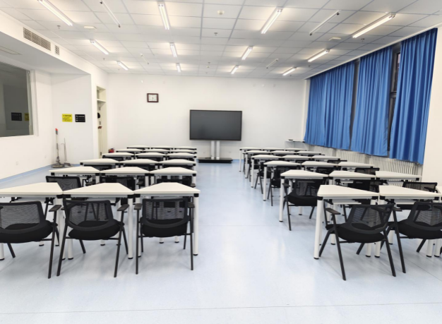 该讨论室配有可移动式智能交互大屏、多功能讨论桌、讨论椅,桌椅可根据不同教学场景灵活变换排列组合方式,充分满足多样化教学需求。