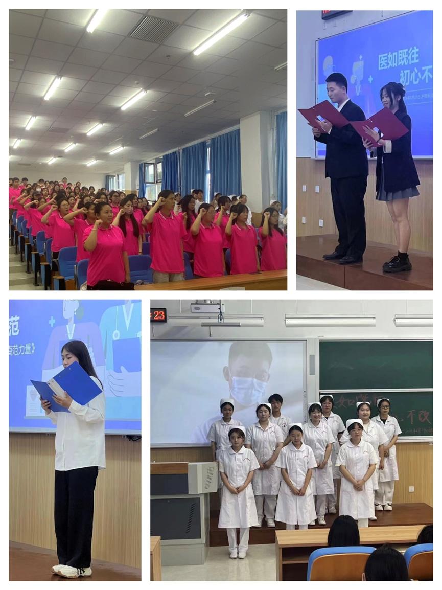 本次活动分为五个环节,学模范、共回忆、观视频、赏歌曲、齐宣誓。伴随着《平凡天使》的歌声,主持人宣布活动正式开始。首先,纪录片《医学之光,模范力量》呈现了医护工作者治病救人、拯救生命的真实场景,每一名医护人员,都是保卫生命的勇士;其次,视频《燕帽如薪火》让大家看到了,纵使成长的路上荆棘遍布,总有指路之人,亦师亦友,薪火相传;再次,通过《医学知识问答》这一互动形式,同学们更加深入地了解了医护历史,感受护理先辈们的智慧与力量;从次,“我祈祷拥有一个健康的身体,和无忧无虑的心灵”,《夜空中最亮的星》医护改编版,让大家在歌声中感受那份对护理事业的执着和热爱;最后,全体同学齐声诵读了《医护职业道德准则》,表达了对医学事业的忠诚和对职业道德的坚守。宣誓仪式结束后,活动现场响起了热烈的掌声,标志着此次道德讲堂活动的圆满成功。