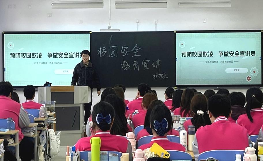 宣讲活动中,护理系师生通过分析时事热点案例,向各班安全委员及学生代表进行预防校园欺凌培训与宣讲。在宣讲过程中,师生们还分享了许多实用的自我保护技巧和方法,帮助同学们更好地应对突发情况。他们鼓励同学们在面对校园欺凌时,要勇敢地说“不”,并及时向老师和家长求助。此次宣讲还进行了普法教育,教会同学们拿起法律武器保护自身不受侵害。