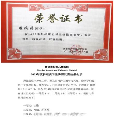 21级护理16班翟婉婷同学以熟练的操作技能在济南市人民医院实习期间荣获“济南市人民医院护理实习技能竞赛”一等奖 ;21级助产2班李嘉敏同学凭借规范的操作流程在潍坊市人民医院实习期间获得“潍坊市人民医院2023年护理实习生专业技能竞赛”一等奖;21助产2班马曦同学在青岛市妇女儿童医院凭借扎实的理论功底和稳健的台风荣获了“青岛市妇女儿童医院2023年度护理实习生讲课比赛”二等奖;47名学生荣获“优秀实习生”荣誉称号;一项项荣誉不仅是对护理系人才培养工作的认可和肯定,更提升了学校的美誉度。